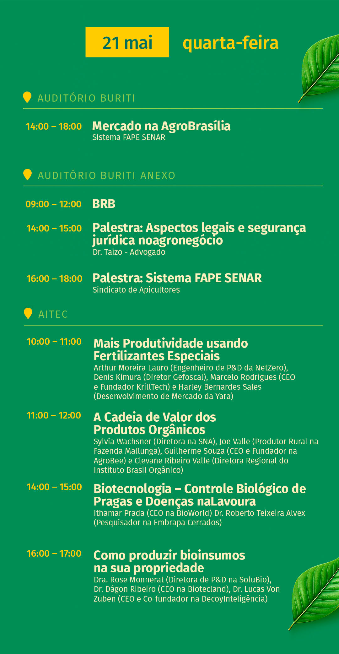 | Local: Parque Tecnológico Ivaldo Cenci Horário: 8h30 às 18h Entrada gratuita Estamos te esperando. AgroBrasília 2025 — Agro, Oportunidade para Todos |