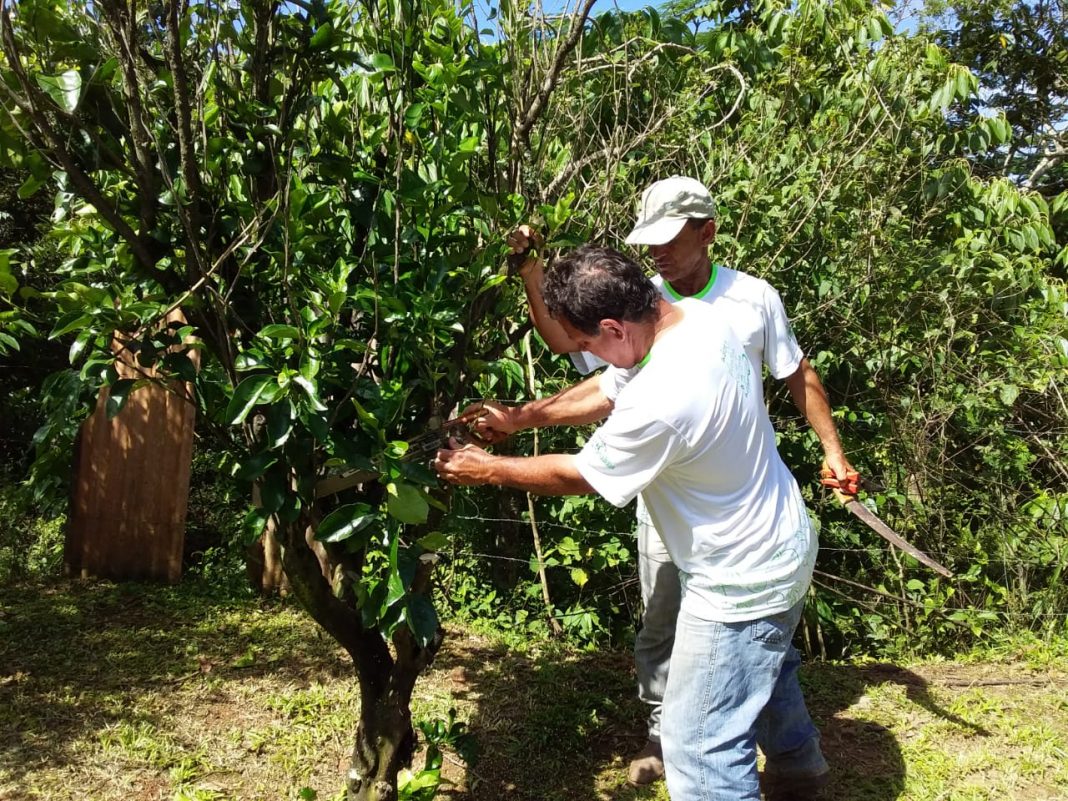 A capacitação aconteceu na propriedade do produtor Leônidas Severino Botelho, em 14 de dezembro, e consistiu na poda de plantas e aplicação de produto biológico para controlar pragas e fungos. A atividade teve a participação do técnico da Emater do município, Wangevaldo Reis Fernandes. Leônidas contou que as plantas do seu pomar estavam cheias de colchonilhas e fungos. Com a orientação da equipe do Mãos Produtivas, os produtores fizeram a poda e prepararam uma mistura para dar combate às pragas. “Fiquei muito satisfeito com a experiência porque, por falta de tempo e por não conseguir combater as pragas, meu pomar estava detonado. Agora eu já sei como podar para que o sol entre nos galhos e os brotos germinem com força e saúde”, disse.
