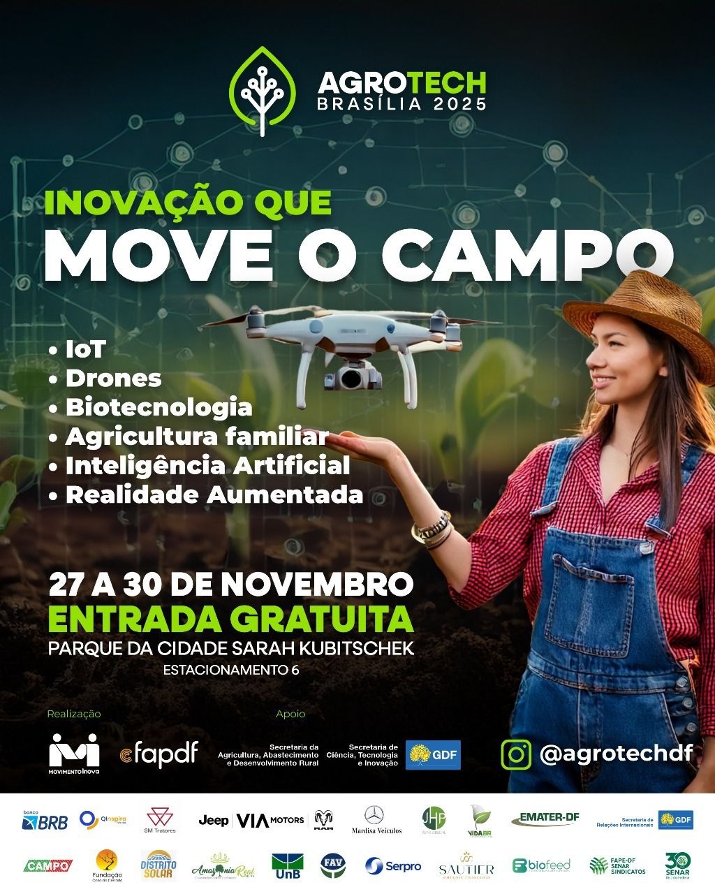 De 27 a 30 de novembro, o Parque da Cidade Sarah Kubitschek (Estacionamento 6) recebe o AgroTech Brasília 2025, encontro dedicado a promover soluções inovadoras para o setor agropecuário e fortalecer o uso de tecnologias que ampliam a produtividade e a sustentabilidade no campo. A entrada é gratuita.