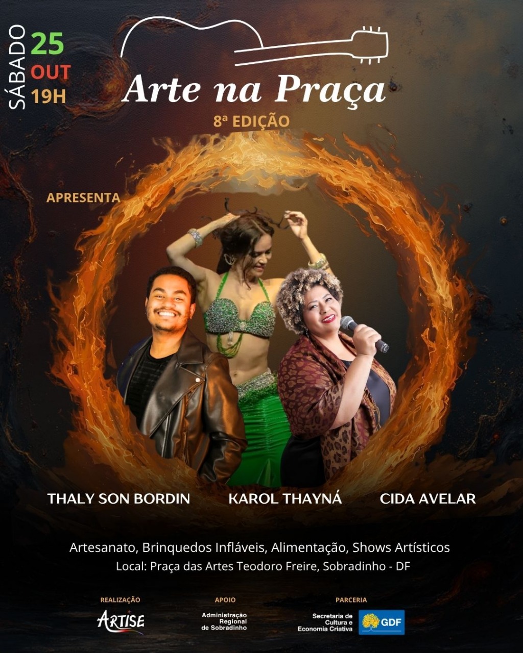 Os quatro primeiros shows desta edição do Arte na Praça contaram com um público excelente, que prestigiou artistas como a Banda Sinfônica de Sobradinho, o guitarrista e cantor Simão Santos (27/09); o roqueiro Fábio Campos e a banda Velho Olho Vermelho (04/10); DJ mirim Rafinha Rammos e o grupo Comboio Kids (11/10). No último sábado (18), a comunidade da região recebeu a KabrunKo Rock, que lançou, em primeira mão, seu novo single “Moda” e a cantora Célia Rabelo, uma das grande vozes do Brasil. E nos intervalos dos shows, o espetáculo sempre é comandado pela dançarina Karol Thayná, com suas performances surpreendentes de dança do ventre.