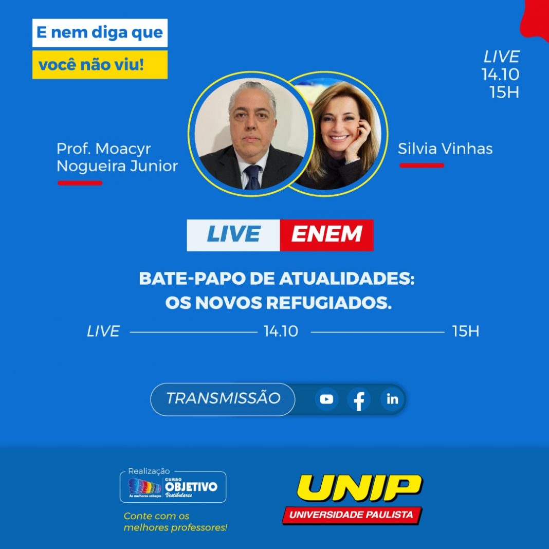 O assunto é tema de vestibular em Atualidades, razão pela qual as redes sociais da UNIP e do Objetivo transmitem, em 14 de outubro, às 15h, a live “Bate papo de atualidades: os novos refugiados”.