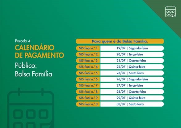 A CAIXA realiza, nesta sexta-feira (30/07), o pagamento da 4ª parcela do Auxílio Emergencial 2021 para beneficiários do Bolsa Família com final de NIS número 0. O recebimento do Auxílio Emergencial 2021 é realizado da mesma forma e nas mesmas datas do benefício regular para quem recebe o Bolsa Família. Para quem recebe por meio da Poupança Social Digital, os recursos podem ser movimentados pelo aplicativo CAIXA Tem e na Rede Lotérica de todo o Brasil, ou sacados por meio do Cartão Bolsa Família ou Cartão Cidadão.