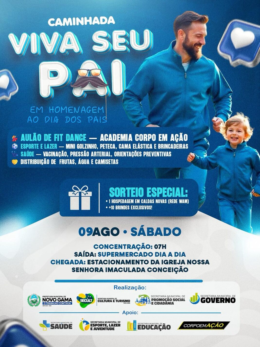 Convidamos toda a população para participar da Caminhada “Viva Seu Pai”, uma homenagem especial ao Dia dos Pais. O evento acontecerá no sábado, dia 9 de agosto, com concentração a partir das 7h em frente ao Supermercado Dia a Dia e chegada no estacionamento da Igreja Nossa Senhora Imaculada Conceição.