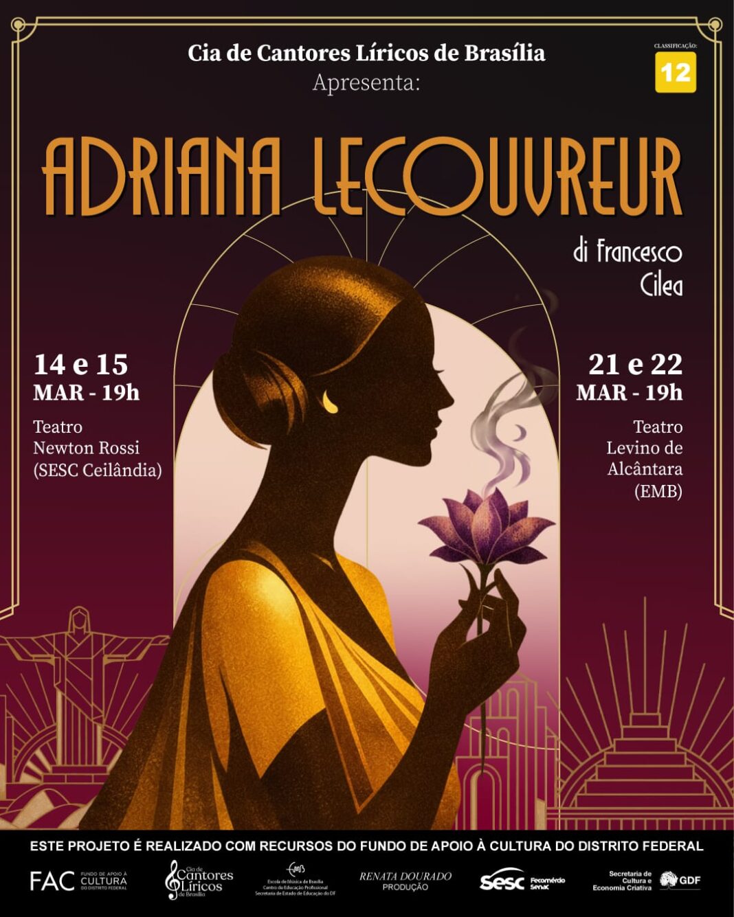Em homenagem ao Mês da Mulher, a Cia. de Cantores Líricos de Brasília leva aos palcos a ópera Adriana Lecouvreur, de Francesco Cilea (1866–1950), em uma curta temporada no Distrito Federal. As primeiras récitas já aconteceram nos dias 14 e 15 de março, no Teatro Newton Rossi (SESC Ceilândia), e a montagem segue, agora, para o Teatro Levino de Alcântara, da Escola de Música de Brasília, nos dias 21 e 22. O projeto é financiado pelo Fundo de Apoio à Cultura do Distrito Federal — FAC.