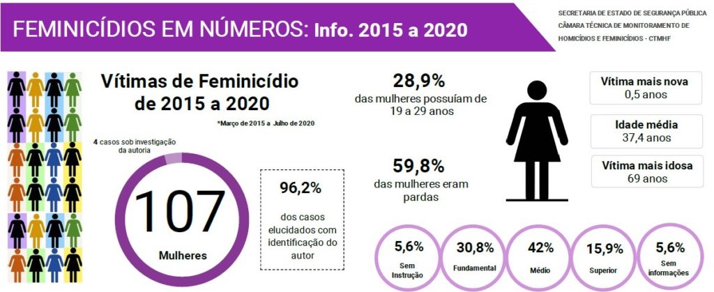 O levantamento mostra ainda o perfil de vítimas e autores. Do total de crimes ocorridos, em 28,9% as mulheres tinham entre 19 a 29 anos, em 59,8% são declaradas pardas e em 42% tinham concluído o ensino médio. Trinta por cento tinham apenas o ensino fundamental, em 15,9% o superior completo e em 5,6% não tinham instrução.