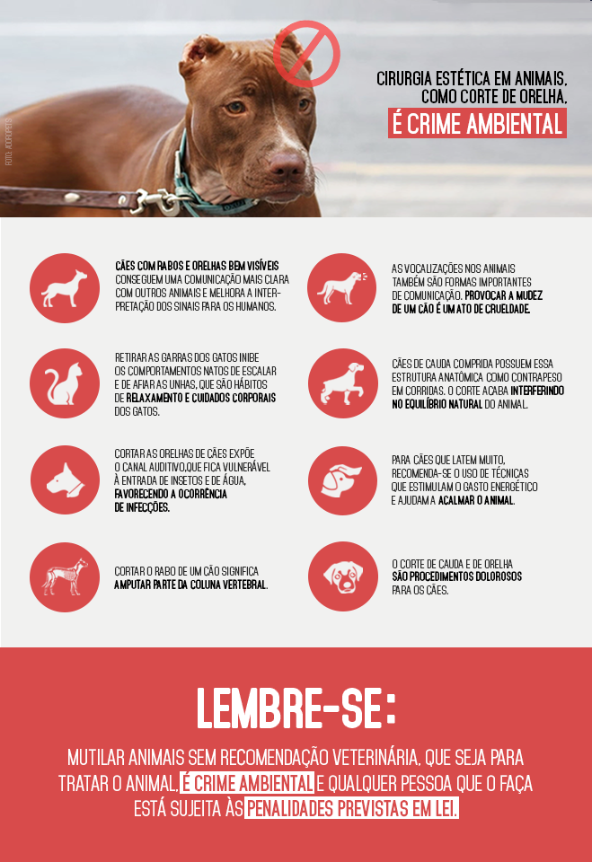 O Conselho Federal de Medicina Veterinária (CFMV) proíbe as cirurgias consideradas desnecessárias ou que possam impedir a capacidade de expressão do comportamento natural dos animais. As resoluções do CFMV nº 1027/2013 e 877/2008 vedam o corte de cauda (caudectomia), de orelhas (conchectomia) e a eliminação das cordas vocais (cordectomia) em cães. Também não permite a retirada das garras em felinos (onicectomia).Essas intervenções cirúrgicas meramente para fins estéticos são consideradas mutilações e maus-tratos praticados contra os animais. A Constituição Federal veda práticas que submetam os animais à crueldade (artigo 23, inciso VII; e artigo 225, § 1º e inciso VII) e o artigo 32 da Lei de Crimes Ambientais (nº 9.605, de 12 de fevereiro de 1998) considera crime as práticas de abuso, maus-tratos, ferir ou mutilar animais silvestres, domésticos ou domesticados, nativos ou exóticos.Por isso, qualquer pessoa que realize esse tipo de procedimento em animais está cometendo crime ambiental e deverá responder civil e criminalmente. Já o médico-veterinário que fizer uma intervenção dessa natureza, se não por motivo de saúde, ainda estará sujeito a processo ético-disciplinar, conforme prevê o Código de Ética e a resolução do CFMV de combate aos maus-tratos (1.236/2018).Essas cirurgias são admitidas apenas em casos específicos, com indicações clínicas e como forma de tratamento do paciente. “O animal com a orelha acometida por bicheira (miíase), por exemplo, sem nenhuma chance de cicatrização, pode ter a amputação da orelha recomendada como medida de controle da infecção, mas para fins estéticos a prática é considerada uma mutilação e, portanto, crime ambiental”, explica a médica-veterinária Liziè Buss, membro da Comissão de Bem-Estar Animal do CFMV.O pequeno corte na ponta da orelha esquerda de gatos de rua, que são castrados dentro de um programa de captura, esterilização, vacinação e devolução, também é outra possibilidade permitida pela legislação. O objetivo é facilitar a identificação dos gatos já castrados e evitar que sejam desnecessariamente recapturados para outra intervenção. Nesses casos, em que a marcação é feita durante a cirurgia de castração, realizada por médico-veterinário, com o animal devidamente anestesiado, o procedimento não configura maus-tratos, nem ato de crueldade. Na verdade, serve de indicação para projetos de manejo populacional e humanitário de gatos, evitando prejuízos ao bem-estar dos animais já castrados.Mesmo em casos excepcionais, como os citados, os procedimentos devem ser realizados exclusivamente por médico-veterinário, seguindo os padrões cirúrgicos e anestésicos de excelência para garantir o bem-estar animal.ComportamentoLiziè explica que os cães se comunicam usando a linguagem corporal e as expressões faciais. Entre essas manifestações, a cauda e a orelha desempenham um papel essencial. “Os cães que dispõem de rabos e orelhas bem visíveis conseguem uma comunicação mais clara com outros animais, o que diminui a ocorrência de brigas, e também melhora a interpretação dos sinais para os humanos”, afirma.Além disso, os cães de cauda comprida possuem essa estrutura anatômica como contrapeso em corridas. “O corte acaba interferindo no equilíbrio natural do animal”, afirma. Já o corte de orelha, ela acrescenta, “expõe o canal auditivo, deixando-o desprotegido e vulnerável à entrada de insetos e de água, o que pode favorecer a ocorrência de infecções”.A médica-veterinária afirma que tanto o corte de cauda como o de orelha são procedimentos dolorosos para o animal. “Cortar o rabo de um cão significa amputar parte da coluna vertebral, cortando a medula. E a orelha é uma região muito irrigada e sensível, qualquer corte costuma causar bastante desconforto ao animal”, garante.As vocalizações nos animais também são formas extremamente importantes de comunicação e provocar a mudez de um cão é um ato de crueldade. “A não ser que o animal tenha um câncer ou outro problema clínico importante, não há justificativa para isso”, afirma Liziè. Para os cães que latem muito, a especialista sugere técnicas de enriquecimento ambiental, de adestramento, de estimulação, de exercício e de gasto energético, as quais ajudam a acalmar o animal e a resolver a situação.Retirar as garras dos gatos é outra prática desnecessária e que inibe um comportamento nato dos felinos que é escalar. Também impede o hábito de afiar as unhas, algo muito relacionado com relaxamento e os cuidados corporais dos gatos. Ela reforça: “Mutilar animais sem recomendação veterinária que seja para tratar o animal é crime ambiental e qualquer pessoa que o faça está sujeita às penalidades previstas em lei”.