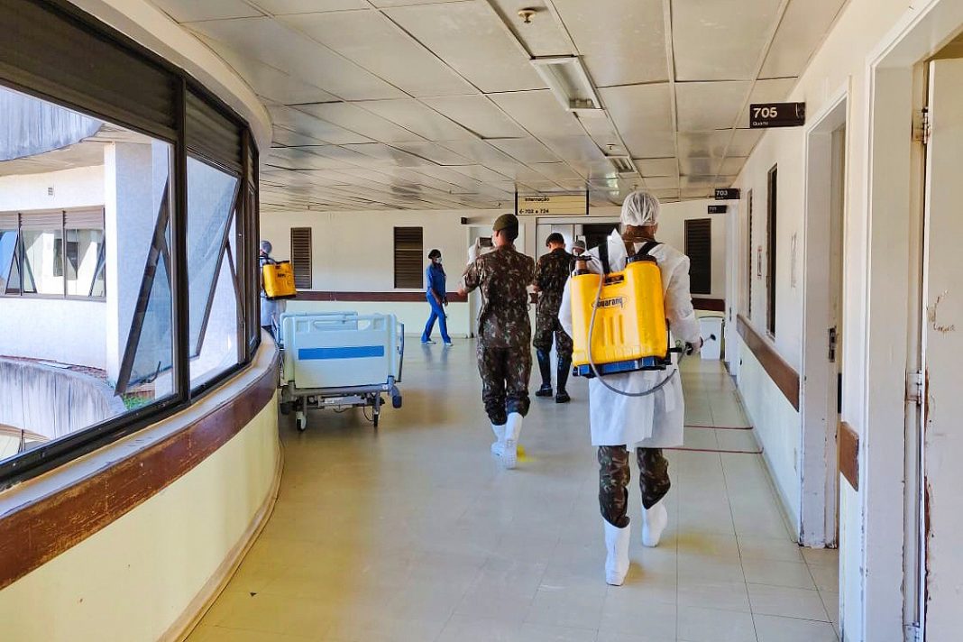 As alas de internação cirúrgica, internação Covid, pronto-socorro, radiologia, laboratório, corredores de acesso e portaria foram sanitizadas. Junto aos militares, as equipes de limpeza que atuam na unidade enxugaram os locais desinfetados.