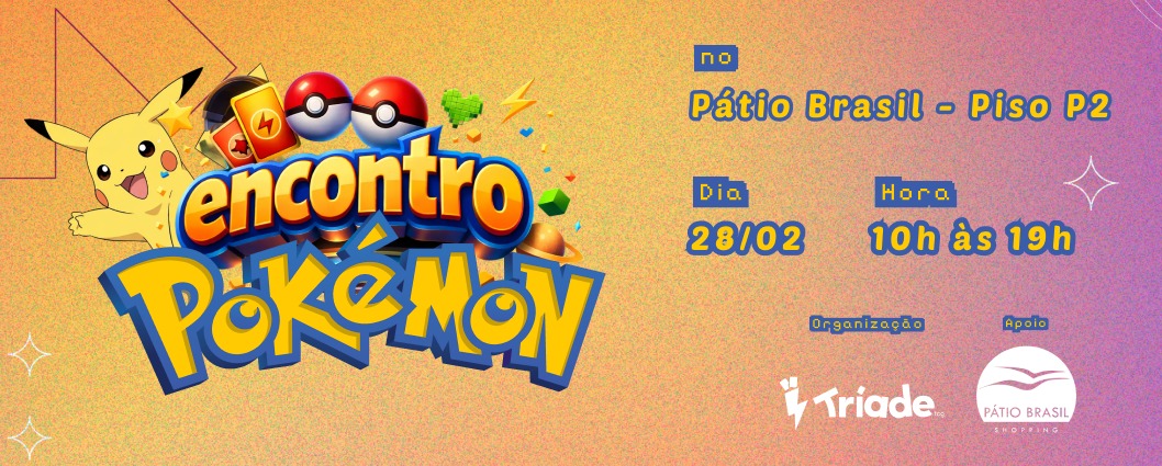 Um dos maiores sucessos da cultura pop mundial vai tomar conta do Shopping Pátio Brasil no sábado, 28 de fevereiro, das 10h às 19h, no piso P2. O Encontro de Cartas Pokémon reúne fãs, colecionadores e admiradores do universo dos Trading Card Games para um dia inteiro dedicado à troca, compra, venda e avaliação de cartas.