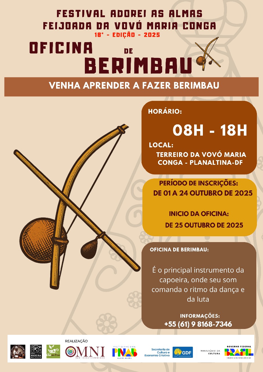 Com foco na valorização das tradições culturais e saberes ancestrais, o projeto oferece ao público, sob o comando do Contramestre Ferrugem, a oficina de Construção de berimbau, rítmicas e capoeira”. A atividade se inicia em 25 de outubro e segue em novembro aproximando os participantes do universo da capoeira, da musicalidade afro-brasileira e da fabricação artesanal do instrumento. A oficina, que oferece 30 vagas cada, é destinada a pessoas a partir de 16 anos e reserva 20% das vagas para PcD e público LGBTQIA+. A proposta reafirma o compromisso com a acessibilidade e a inclusão, com tradução em Libras e audiodescrição. Na primeira fase, o festival ofereceu a oficina de “Benzimento e produção de garrafadas, chás, tinturas e pomadas”, conduzidas pelas mestras Mãe Maria do Cerrado e Josefa Ataídesque. Elas mobilizaram participantes desde o início de setembro, fortalecendo a circulação do conhecimento tradicional e popular.