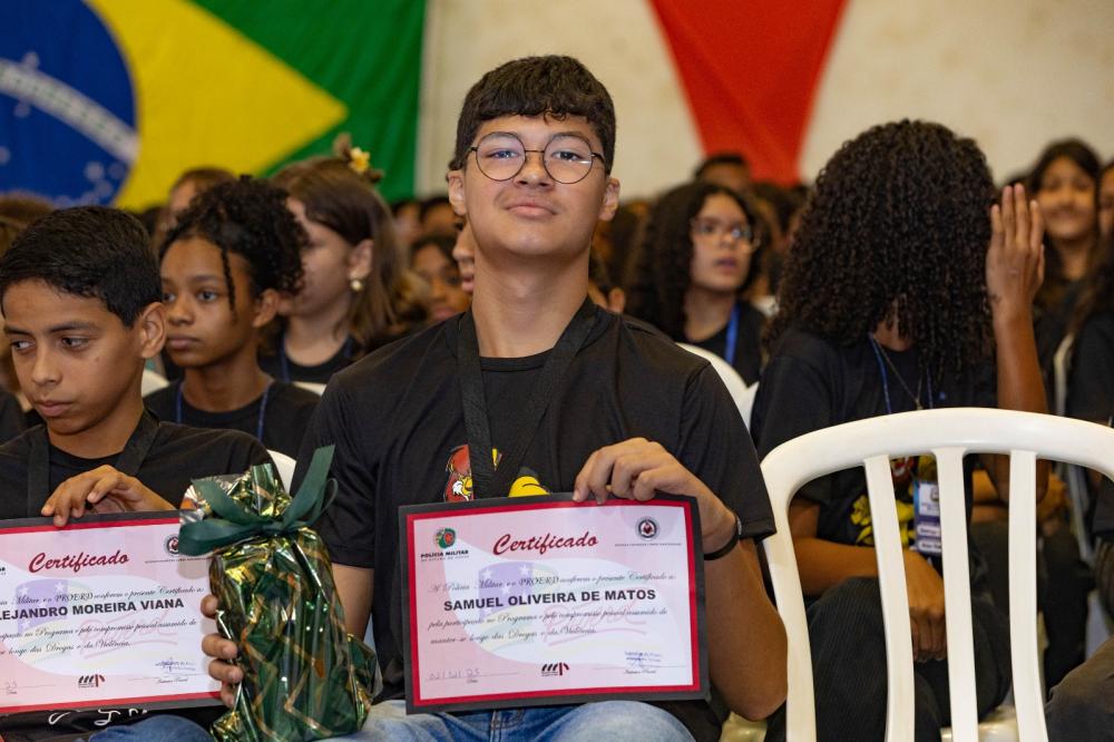 Ao longo do programa, os alunos participaram de atividades e palestras conduzidas pela Polícia Militar, aprendendo sobre prevenção ao uso de drogas, respeito, autocontrole, convivência pacífica e tomada de decisões responsáveis, valores essenciais para a formação cidadã e para a construção de um futuro mais seguro.