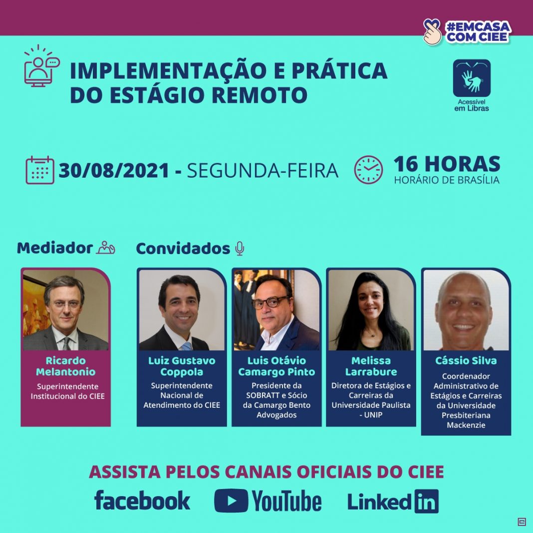 Promovida pelo Centro de Integração Empresa-Escola – CIEE, a atividade será transmitida em suas redes sociais e terá como mediador o superintendente Institucional Ricardo Melantonio.​