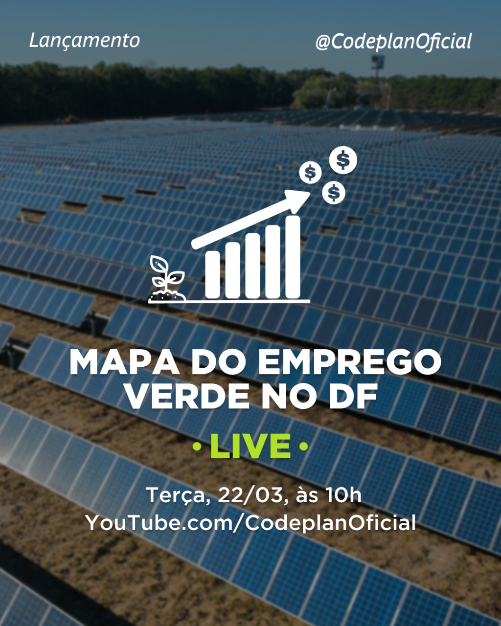 Na próxima terça-feira (22), às 10h, será divulgado, no canal do YouTube da Companhia de Planejamento do Distrito Federal (Codeplan) o Mapa do Emprego Verde no DF. Ao analisar a situação do mercado de trabalho ligado à economia verde e seu potencial crescimento na capital federal, o projeto tem o objetivo de orientar que políticas públicas contribuam em quatro eixos: a redução do desemprego, a qualidade de vida da população, o meio ambiente e o aumento da sustentabilidade econômica.