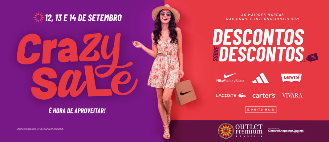 No mês do cliente, o Outlet Premium Brasília realiza, nos dias 12 a 14 de setembro, a segunda edição da Crazy Sale, tradicional campanha que une descontos em cima dos valores já remarcados de grandes marcas nacionais e internacionais, como Nike, Adidas e Lacoste, entre outras, a entretenimento, em um final de semana especial, recheado de atrações surpresa que prometem agradar toda a família.