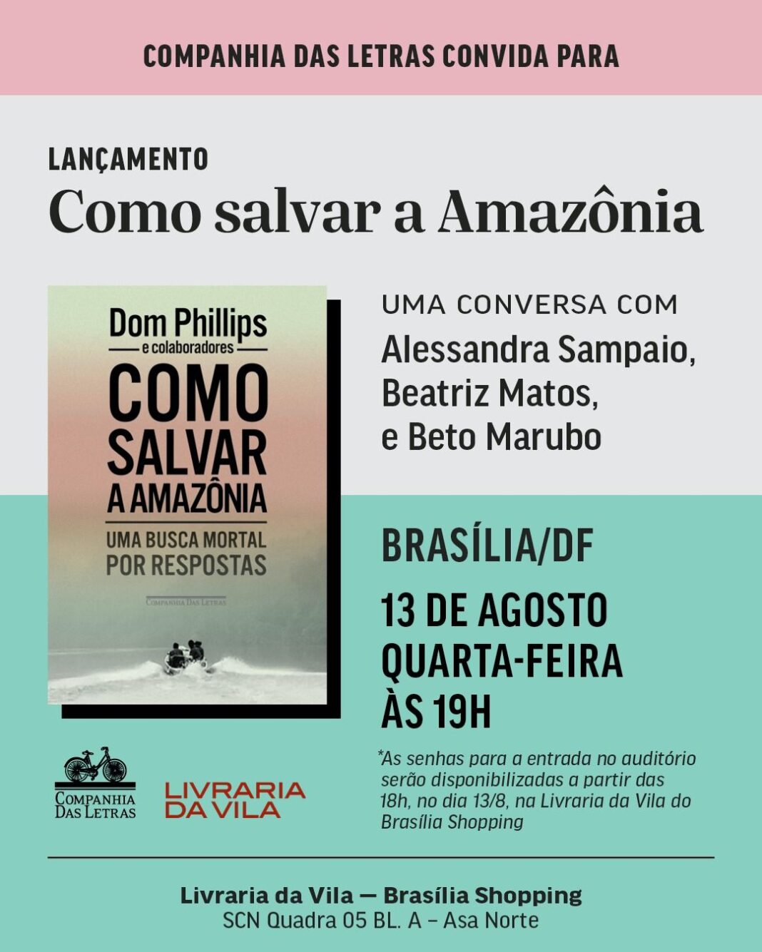 No dia 13 de agosto, das 19h às 21h, o Teatro Brasília Shopping recebe um encontro especial sobre o livro Como Salvar a Amazônia: Uma busca mortal por respostas, obra póstuma do jornalista britânico Dom Phillips, recém-lançada no Brasil. Promovido pela Livraria da Vila, o evento conta com a participação de Alessandra Sampaio, esposa de Dom, que tem se dedicado a divulgar o legado do companheiro e a importância da pauta ambiental que ele abraçou com tanta coragem.