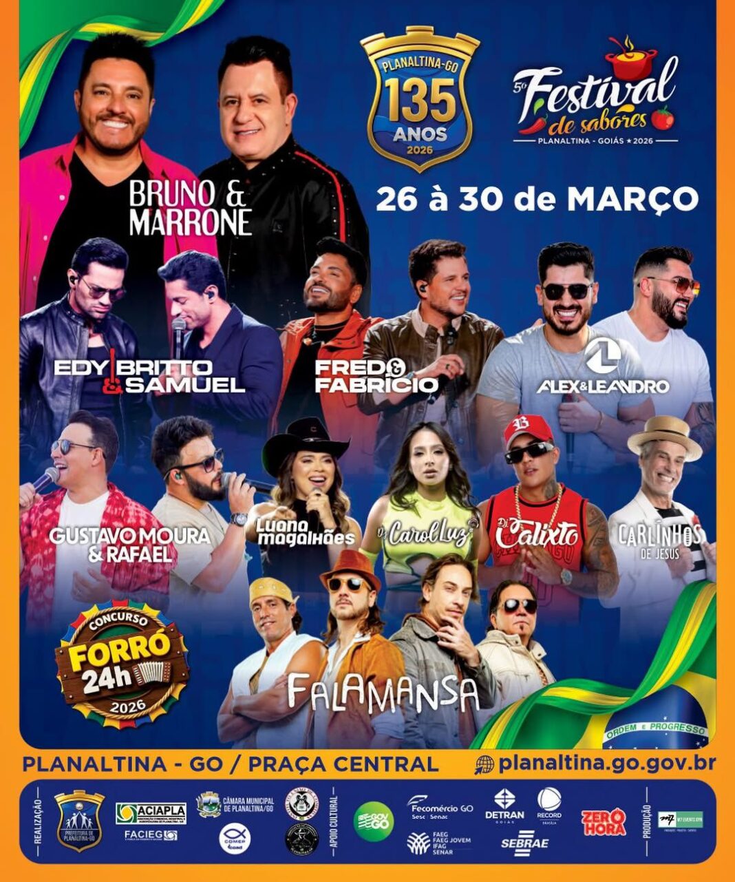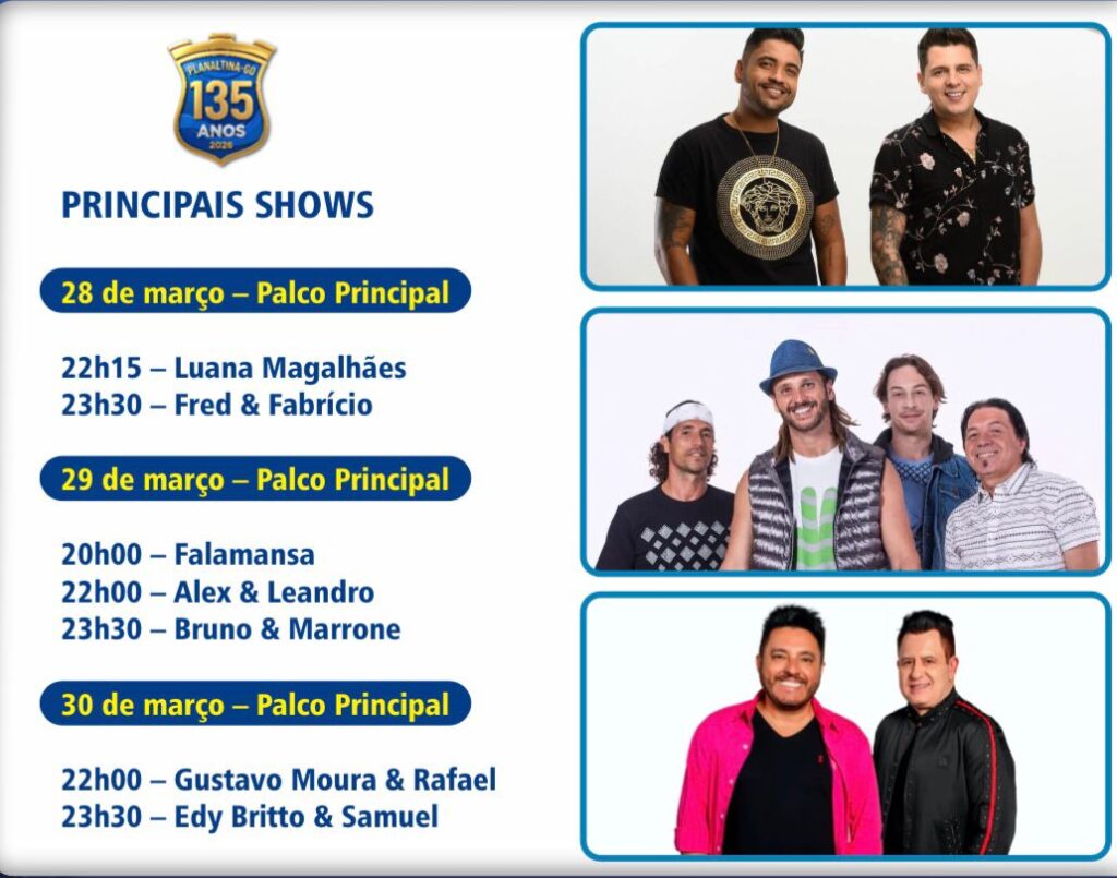 Entre os destaques da programação estão shows de grandes nomes da música brasileira, como Bruno & Marrone, Falamansa, Fred & Fabrício, Gustavo Moura & Rafael, Edy Britto & Samuel, além de Luana Magalhães e Alex & Leandro.