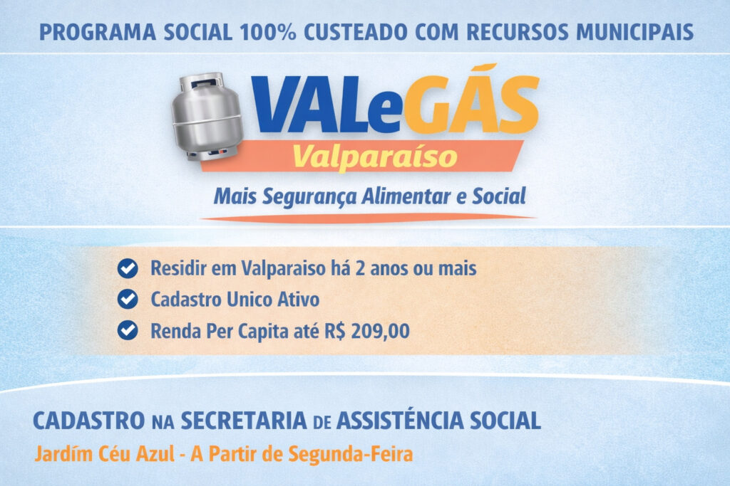 A Prefeitura de Valparaíso de Goiás publicou, nesta quinta-feira, o decreto que regulamenta o VALeGÁS, programa social criado para fortalecer a segurança alimentar e social das famílias em situação de vulnerabilidade no município. A iniciativa é uma política pública de Valparaíso, custeada integralmente com recursos municipais.