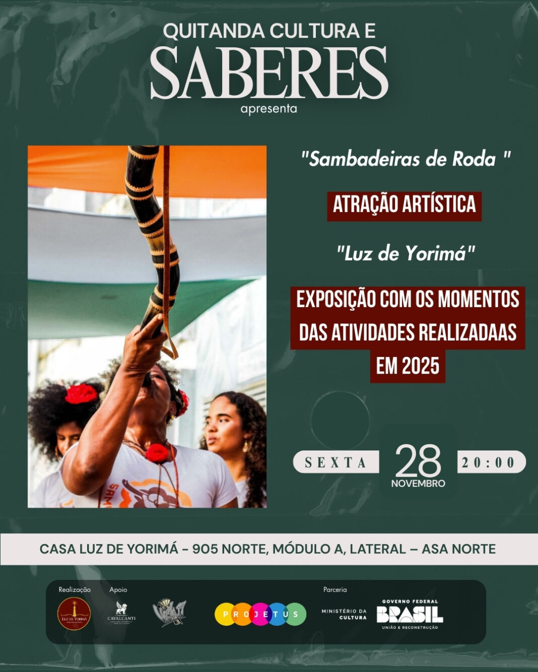 O projeto Quitanda Cultura e Saberes, que desde agosto promove ações artísticas e formativas voltadas às expressões da cultura afro-brasileira, indígena e periférica, encerra sua edição de 2025 nesta sexta (28), às 20h, com uma celebração repleta de ancestralidade, potência e encontros na Casa Luz de Yorimá (905 Norte), marcada pela apresentação das Sambadeiras de Roda. A programação é gratuita e aberta ao público.