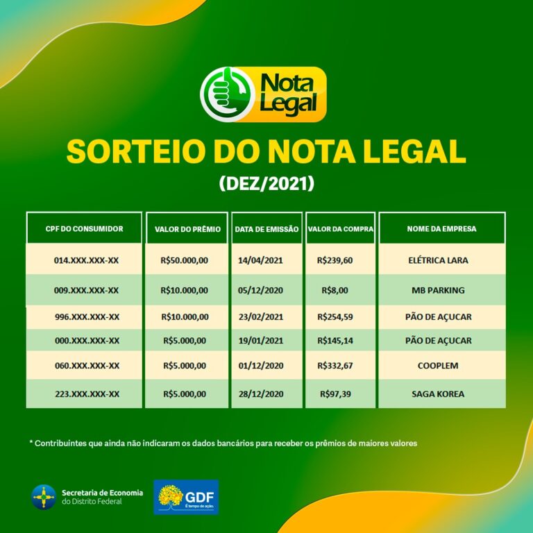 No dia 28 de junho será realizado o próximo sorteio do Nota Legal. Concorrem aos prêmios todas as notas emitidas no período de 1º de maio a 31 de outubro de 2021. Ao todo, 12.600 bilhetes serão premiados dentro de 51.335.194 gerados para o sorteio. A informação está no Diário Oficial do DF (DODF) da última quarta-feira (15).