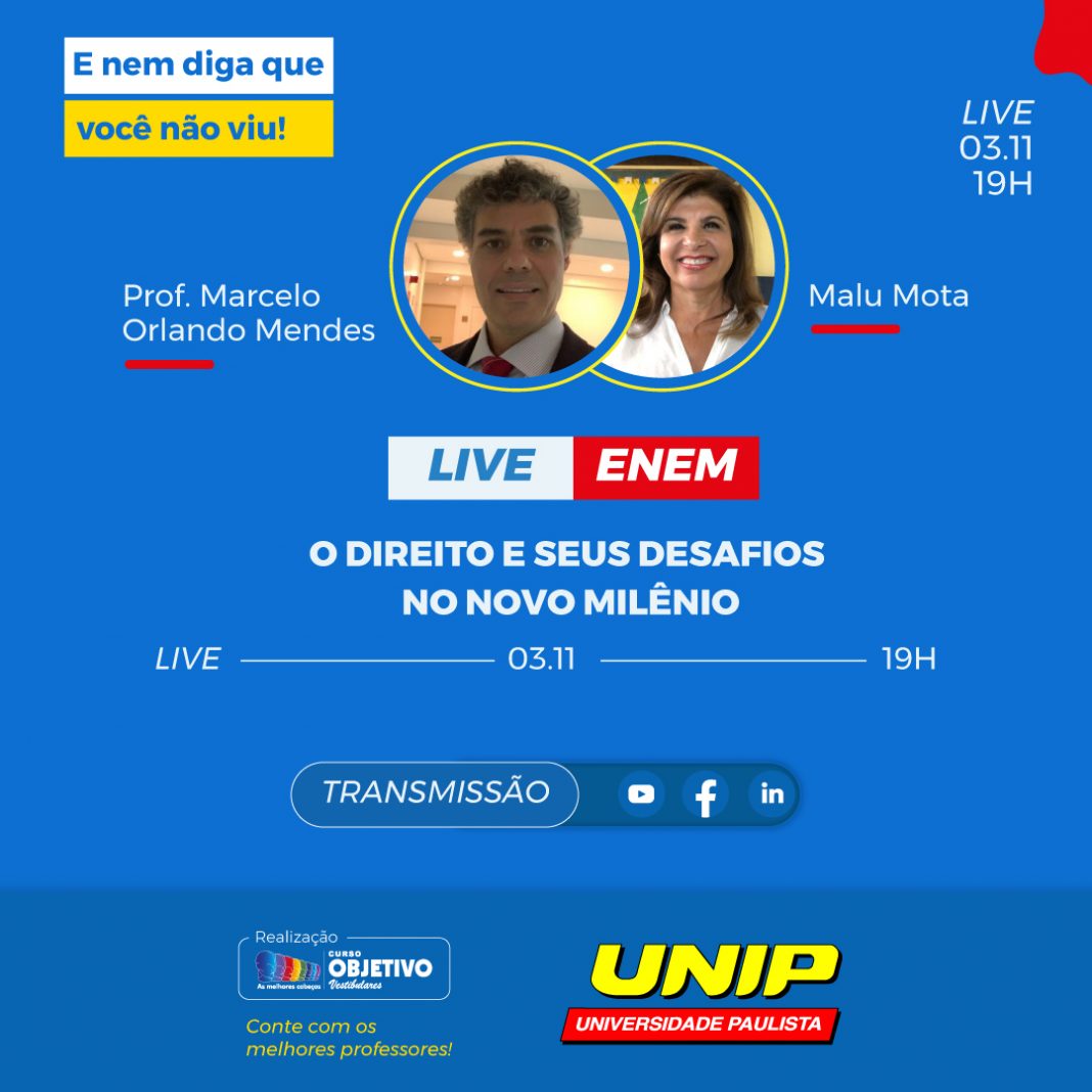 “O Direito e seus desafios no novo milênio” é tema de live que a UNIP e o Objetivo transmitem no próximo dia 3 de novembro, às 19h, pelas redes sociais oficiais das instituições.