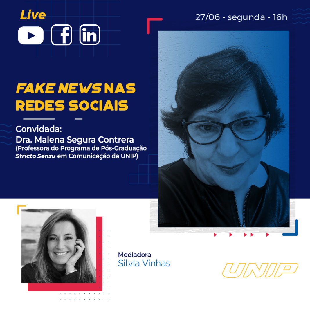 Essas e outras questões serão assunto da live “Fake News nas redes sociais”, que será transmitida pelas redes sociais da UNIP em 27 de junho, às 16h.
