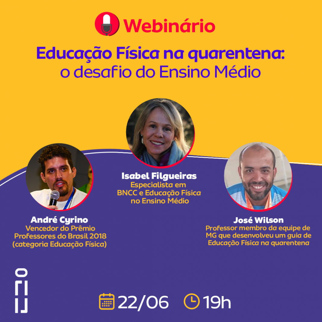 O bate papo contará com a mediação de Eduardo Butter, membro do Impulsiona e terá como convidados os professores André Cyrino, vencedor do Prêmio Professores do Brasil 2018 na categoria Educação Física, Isabel Filgueiras, especialista em Educação Física e BNCC para Ensino Médio e José Wilson, membro do grupo responsável pelo Plano de Estudos Tutorados de Educação Física durante a quarentena em Minas Gerais.